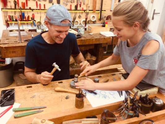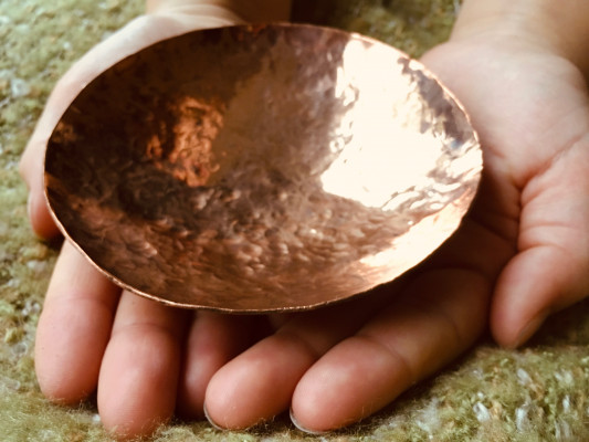 Wir tauchen in ein altes Handwerk und erfahren, wie sich Kupfer durch weichglühen, hämmern, treiben und feilen verformen lässt.